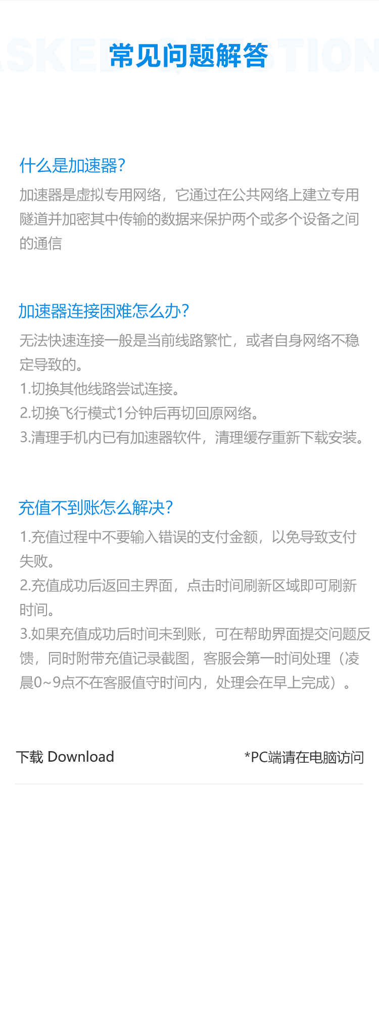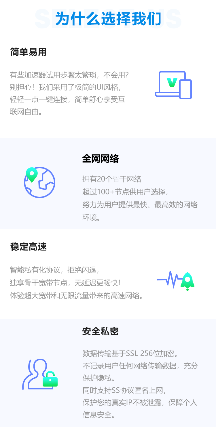 拥有20个骨干网络,超过100+节点供用户选择,努力为用